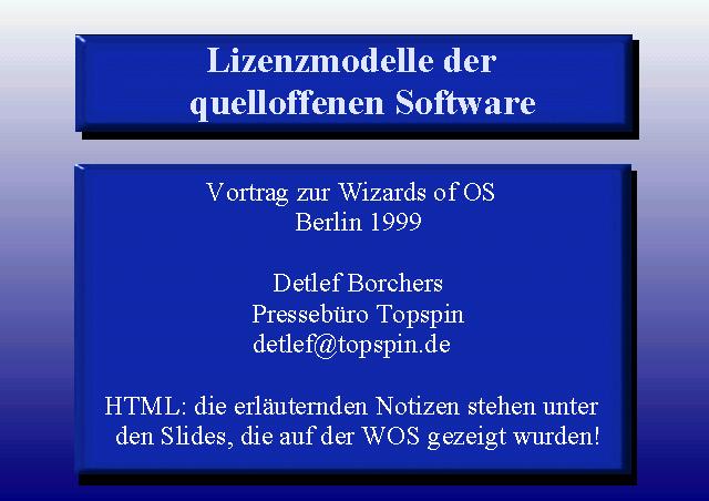 Dieser WOS-Vortrag sollte eine Podiumsdiskussion zwischen freien Entwicklern und Firmenvertretern einleiten. Es kam, wie es kommen musste: das Podium war brechend voll, die Zeit knapp und das Publikum einigermaßen erschöpft. Nur ein paar Slides konnten gezeigt werden. Hier der Rest.