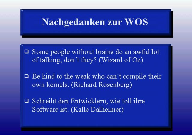 Im amerikanischen Umfeld, das weitaus heftiger auf Open Source-Ideen reagiert, ließ IBM die Vertreter der sechs größten Linux-Distributionen zum Testimonial antereten. Von Caldera bis TurboLinux wiederholte jeder brav und artig, wie toll es ist, in diesem aufregenden Markt mit IBM arbeiten zu dürfen. Von Linuxgrüven keine Spur. Das hatte die Wizards of OS reichlich zu bieten.