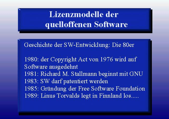 Die Frage der Patentierbarkeit von Software ist heute wieder einmal hochaktuell, weil die EU die US-Regelung übernehmen will. (siehe http://www.freepatents.org und http://swpat.ffii.org). Hier sei nur daran erinnert, mit welcher Prozessflut Firmen kämpften, etwa Lotus gegen Paperback Software, Mosaic Software und Software Arts zum Look and Feel, Microsoft gegen Quarterdeck Office Systems über Multitasking. Xerox gegen Apple, Apple gegen Microsoft, Autodesk gegen Autokey: Praktisch keiner der heute noch existierenden Firmen ist von einem Patentstreit verschont geblieben. Praktisch alle Generalpatente (Freeny-Patent, Comptons Patent etc.) scheiterten.