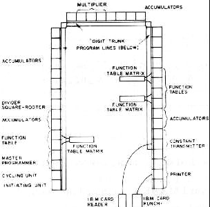 Der ENIAC hat zwei Nachfolgenerationen, den IAS, WHIRLWIND, von dem noch zu sprechen sein wird, bis hin zu der IBM-Linie 700, die ziemlich direkt dann in unsere deutsche Gegenwart führt und die mehr universitär ausgerichteten Produktlinien EDVAC, EDSAC und UNIVAC, die uns auch noch kurz begegnen werden. 6.3.2 Ausdehnung und AufbauDer Aufbau des Rechners: Vier Akkumulatoren, eine "Square-Rooter"-, eine "Multiplikations-Einheit", drei aufwendige Funktionstafel-Einheiten zur![]() Matritzenberechnung, links unten die drei Kontroll-Einheiten und rechts die Lochkarten-Eingabe und Ausgabe[3]. Alle benannten Einheiten mußten zunächst für sich "programmiert" werden, was hieß: über Steckfelder verkabelt werden. 6.3.3 ProgrammierungDie Programmierung des ENIAC zerfiel in zwei getrennte Teilbereiche, "numerical programming" und "programming proper":6.3.3.1 "Numerical Programming" Die Abbildung zeigt eine solche "Programmierung" einer Akkumulator-Einheit, wie sie in etwa auch im ENIAC verwendet wurde. Oben sehen sie die gesteckte Berechnung "a*b + c + d". Diese Arbeit an solchen Steckfeldern hieß, wie Arthur Burks berichtet, "numerical programming" und mußte je nach Formelberechnung an allen Akkumulator- bzw. Square-Root oder Function-Einheiten in dieser Weise jeweils separat geschehen. Überwiegend Spezialistinnen-Arbeit, den ENIAC-Girls. Um die Übersicht zu behalten, wie der Verlauf solcher "numerical programmings" vonstatten gehen sollte, wurde solche Blockdiagramme angefertigt: Die Blockdiagramme legten fest, was in welchen Einheiten des ENIAC zu geschehen hatte, welcher Akkumulator welchen Formelteil zu berechnen hatte usw. `Numerical Programming Assignment' könnte man das nennen, eine erste Art der Zuweisung also, denn die Akkumulatoren waren ja nichts anderes als intelligente Speicherstellen des Rechners. Für ihre Codierung, d.h. den Plan ihrer Verkabelung, existierte keine verallgemeinerte symbolische Schreibweise. In solchen Ablaufdiagrammen finden wir die Vorläufer der ersten Programmierroutinen. Im übrigen handelt es sich um eine der ältesten Repräsentationen des Rechnens. In ein "diágramma" zeichneten die Griechen ihre geometrischen Figuren und deren Ableitungen. "Diágramma" hieß darüberhinaus, weil Tonfolgen als eine Ableitung kosmischer Geometrie verstanden wurden, die Tonart. Im ENIAC ist es der Umriß eines Programmablaufs, der in Diagrammen festgehalten wird; eine graphische Schnittstelle zwischen der Mathematik der zu berechnenden Formel und dem elektronischen Plan ihrer numerischen Lösbarkeit. Solche Diagramme konkret zu implementieren, wurde im ENIAC lakonischerweise "programming proper" genannt. Als wenn es sozusagen nichts einfacheres gäbe als das. 6.3.3.2 "Programming Proper"Das "programming proper" bestand nun darin, die einzelnen Units mit dem "digit trunks", also mit dem Datenbus einerseits, und mit den "program lines", von denen es parallele sieben gab, andererseits zu synchronisieren. Dafür wurden weitere Diagramme angefertigt: Es mußten die Transmit-