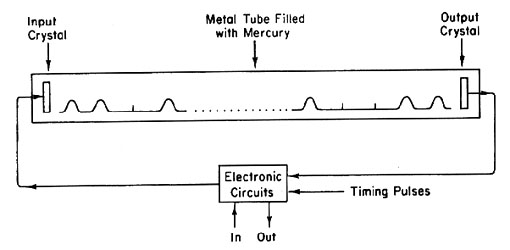 6.3.4 "Mercury Delay Lines"Daß sich aus dem ENIAC, einer Röhrenmaschine, und nicht aus den elektromagnetischen Rechnertypen das Konzept des "stored programmings", der gespeicherten Programmierung, entwickelte, liegt auf der Hand. Im ENIAC war ein im Prinzip schneller Bus geboren und die Technik war robust genug, über eine Impulssteuerung ein System, das so groß wie ein halber Ballsaal war, im 3 1/2 KHz-Takt zu triggern. Das wiederum eröffnete nun die Möglichkeit, die mechanisch nahezu unlösbaren Speicherprobleme endlich anzugehen, indem man, wie Sie wissen, alle möglichen impulsgesteuerten Verzögerungssysteme erfand, im ENIAC-Fall die "Mercury Delay Lines" zum Beispiel, die auch Turing verwendete. Niemand anders als Pres Eckert (Metropolis u.a.:1980,531) hatte sie im Frühjahr 1944 für Radareinrichtungen entwickelt, ein weiterer "Radar-Input" in den Computer also. Die Mercury Delay Line: eine schmale, zum Beispiel zwei Meter lange Röhre, in der ein pulsierendes Ultraschallsignal um bis zu 1 Millisekunde verzögert werden konnte, und zwar durch "mercury", zu deutsch Quecksilber, mit dem das Rohr gefüllt war. Durch eine geschickte Schaltung war es möglich, mit nur zehn "tubes", also Röhren, die etwa 1000 Impuls-Bits, jeweils eine Mikrosekunde voneinander getrennt, aufzufrischen. Wodurch ein getakteter elektronischer 1K-Bit-Speicher zum Preis von ein paar Liter Quecksilber und 10 Röhren a 10 $ entstand. Die "Mercury Line" war insofern der durchschlagend revolutionäre Punkt: sie ließ den Preis und den Platz für das Speichermedium mit einem Schlag um den Faktor 100 : 1 sinken. Eine Kaskade von 256 solcher "Mercury Lines" konzipierte das Team von März bis Juni 1945 als das 32 K große Memory für Daten und Programminstruktionen eines neuen Rechnertyps, den wir heute die "von Neumann Maschine" nennen. Die getakteten Speicherbausteine verlangten nach einer getakteten Busarchitektur, die Adresslogik des Busses verlangte nach Reduktion der verteilten Akkumulatoren, Multiplikatoren und "Square Root Units" auf einen Baustein, der zentralen Arithmetischen Einheit, und das gesamte System somit nach dem General-Takt der "Central Control". Weit ab von Turings logischer Maschine verlangte hier allein schon die Synchronisation der so beschriebenen Elektronik-Architektur nach der legendären diskreten Sequentialität, unter Preisgabe der so größzügig ausgerüsteten Parallelarchitekturen, wie sie der ENIAC noch repräsentierte. Die ab jetzt gültige "guideline" für einen der erfolgreichsten Maschinentypen, den Menschen je gebaut haben, hieß in Burks lakonischen Worten: