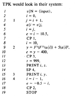 7 Von Neumanns PartiturenNach der Frage, wie die "von Neumann"-Maschine entsteht, wäre die Frage interessant, wie von Neumann sie programmiert hat. Mit Hilfe von Donald Knuth und Luis Pardo will ich die Frage ansatzweise beantworten. Um die Sache nicht vollends unüberschaubar zu machen, gehen wir, für alle folgenden Beispiele, von einem einfachen, ziemlich nutzlosen Progrämmchen aus, das in ALGOL60 notiert ist, und werden es dann rückübersetzen in die jeweiligen "Stile", hier also in den "Stil" John von Neumanns.