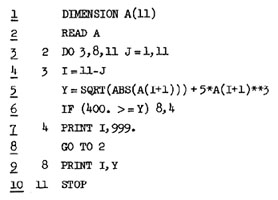 Ihnen brauche ich über FORTRAN natürlich auch nichts mehr zu sagen, die DIMENSION-Deklaration in Zeile 1 verlangt ein 11-stelliges Array von REAL-Zahlen, Zeile 2 liest das irgendwie ein, Zeile 3 zeigt uns das legendäre DO-Statement von FORTRAN, das in der 0-Version die Besonderheit hat, die Anfangs- und Endlabel zu bennen, also auf deutsch heißt Zeile 3: Iteriere ab Zeile mit Label 3 bis Zeile mit Label 8 solange, bis die Variable J den Wert 11 angenommen hat, dann gehe zu Label 11 und Schluß. Das IF-Statement war damals nur zweiwegig, aber ansonsten ist es einfach FORTRAN. In FORTRAN, der Sprache des