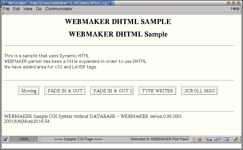 As we have stated at the beginning, WEBMAKER is an independent tool created for the local currency settlement system -- Winds. In bookstores you can find samples and introductory references to various types of CGI. WEBMAKER can provide a means to create these individual CGI systems with a unified view. We believe that it can create simple questionnaires or bulletin boards without much difficulty. However, it is also true that our WEBMAKER has not yet completed its development. We would very much appreciate your help.