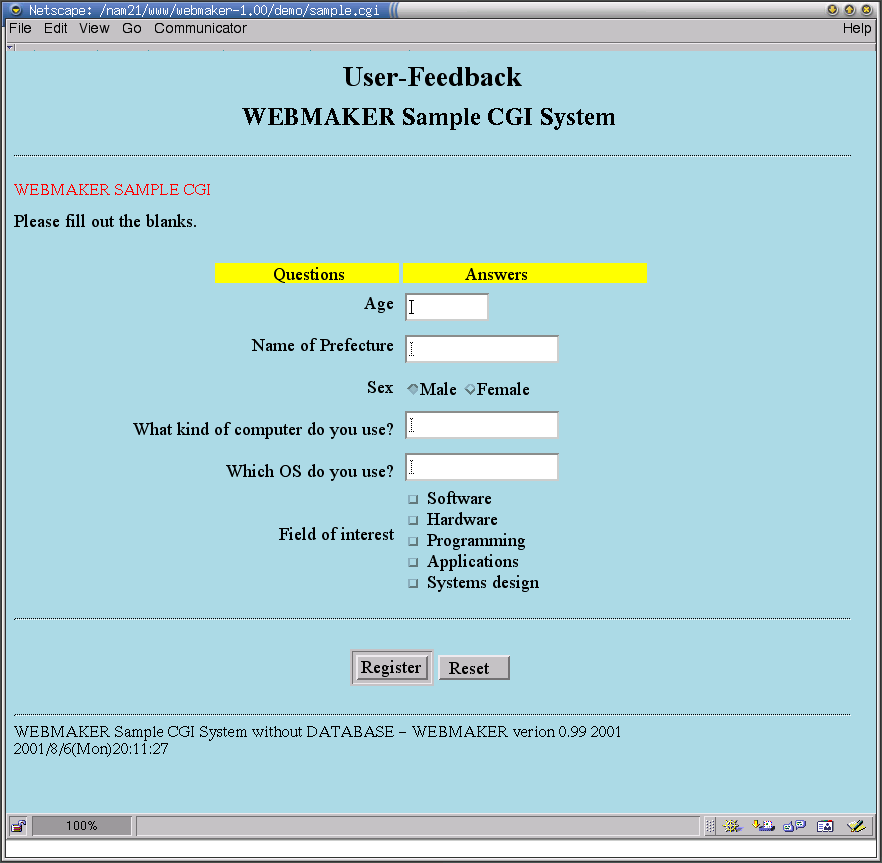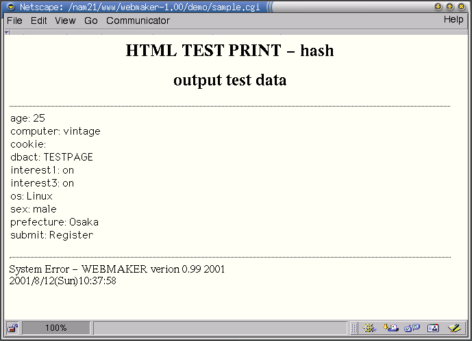 The sample CGI files that come with WEBMAKER package do not include demonstration code for the database access. We thought it would not make sense to supply a demonstration code if database software such as PostgreSQL or MySQL was not installed. Nevertheless, once you prepared such software, examining database routines like the above will not be a hard task.